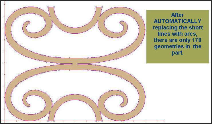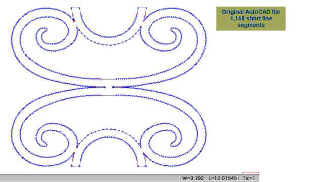 The CAD file for the finished part in the picture below consisted of 1,148 consecutive short line segments. PEP Technology’s CAD Converter automatically replaced every line segment with a tangent arc segment and developed the finished cutter path in 2 minutes.